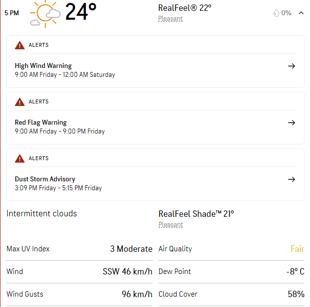 土曜の朝、朝日が昨日の強風と砂嵐と山火事の煙で見通しが全然よくないなか出てきて東側を明るく照らし始めている。今朝は・・幸運なところ今は無風状態。
